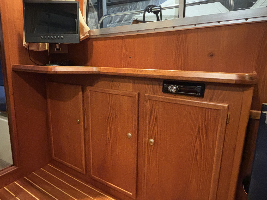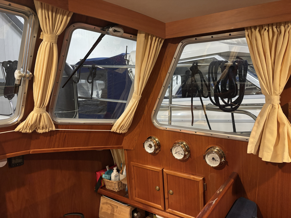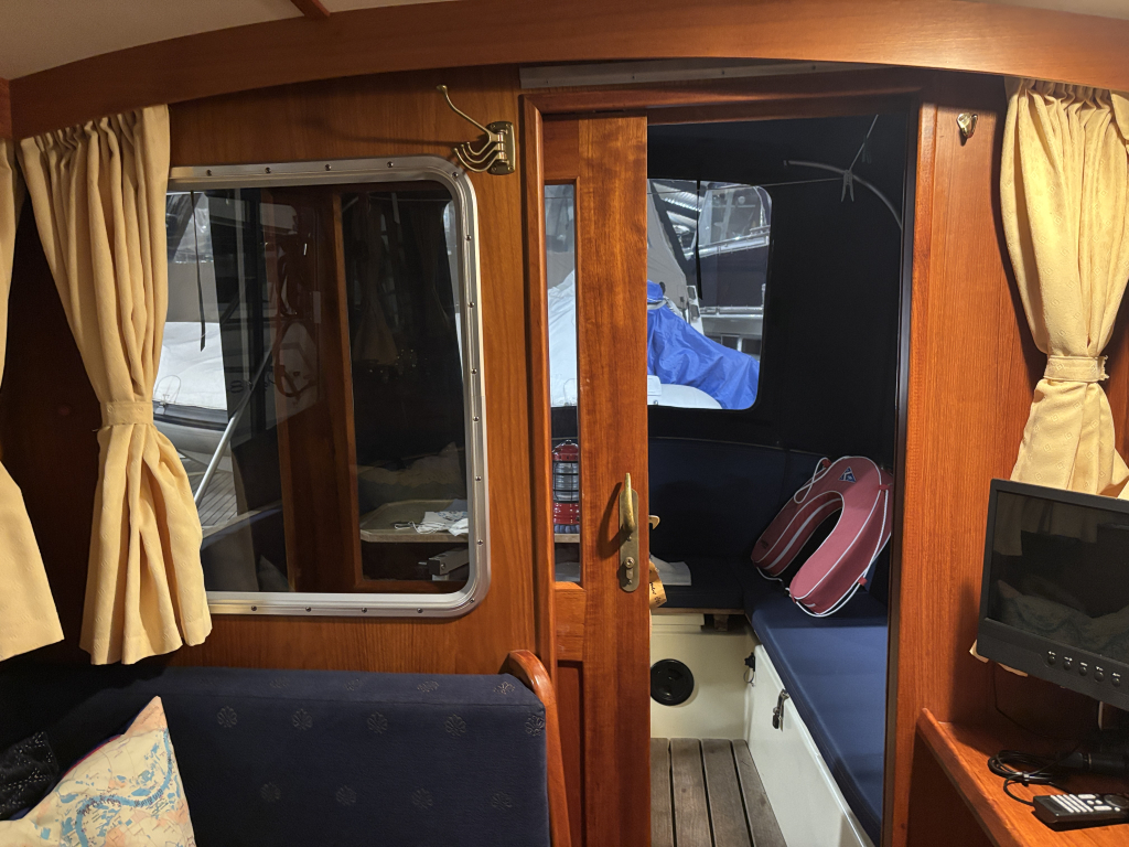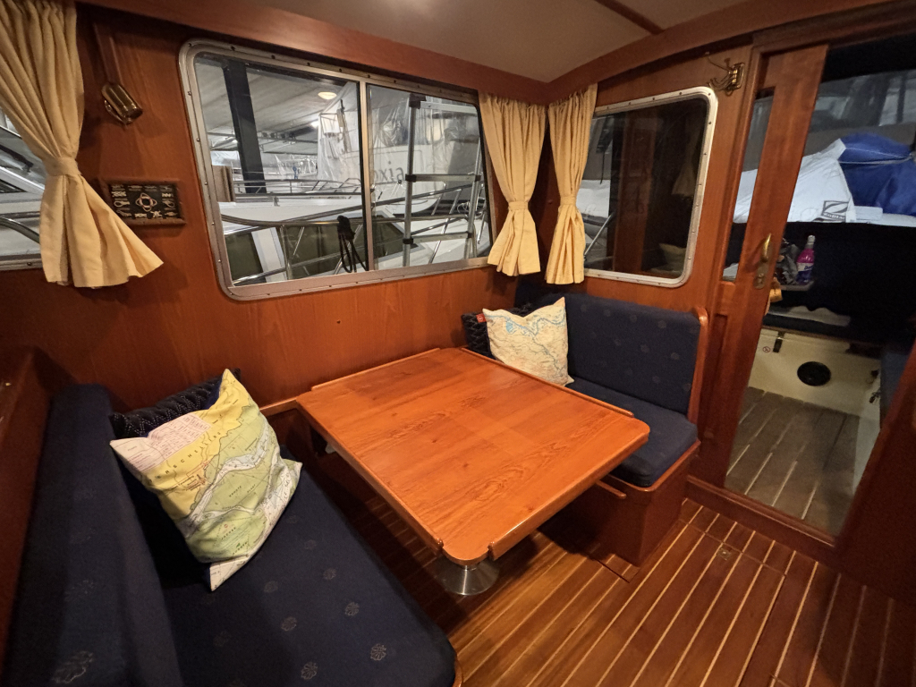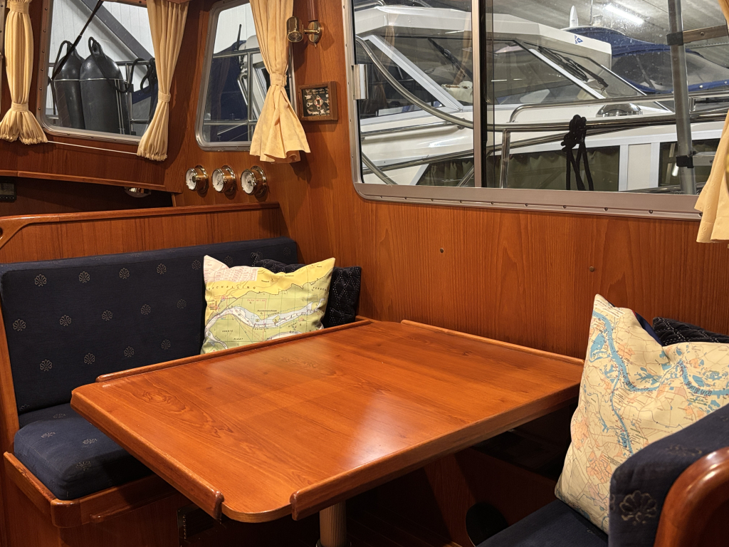 In het stuurhuis: twee zitbanken in dinette opstelling, het tafelblad is voorzien van veersysteem.