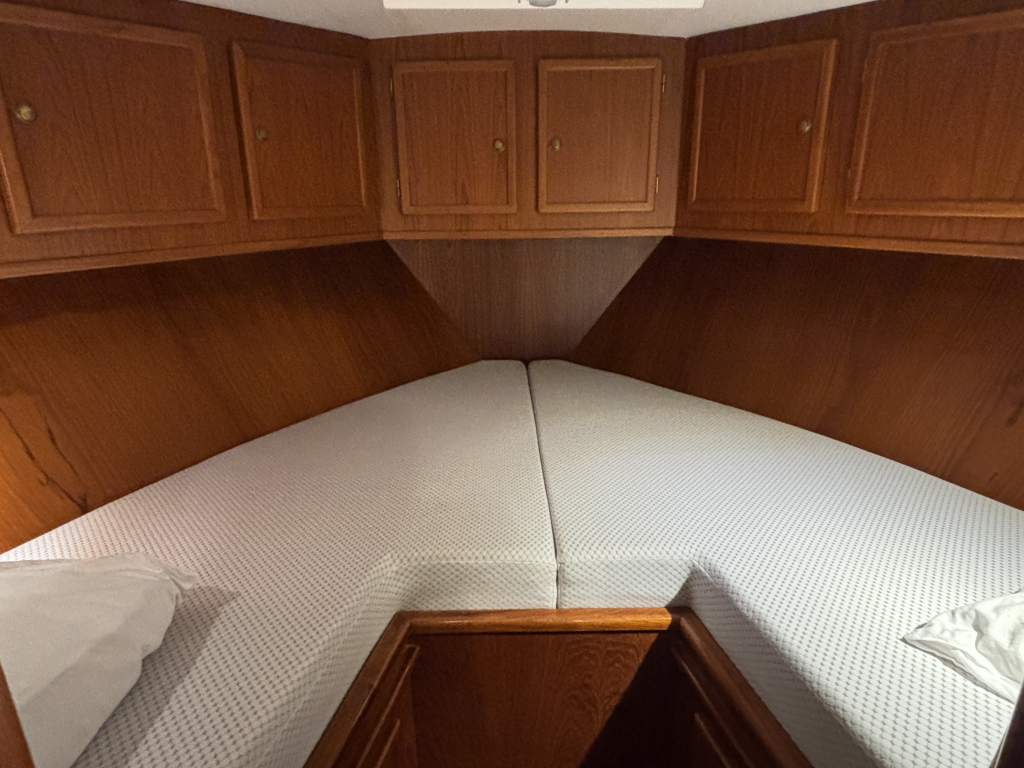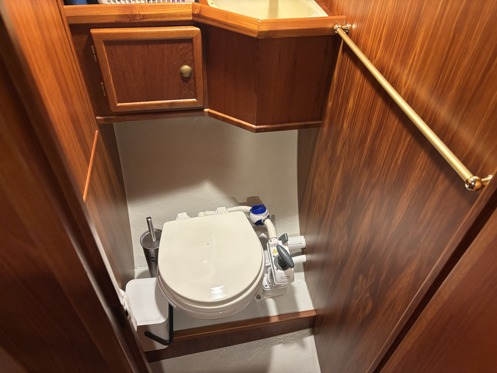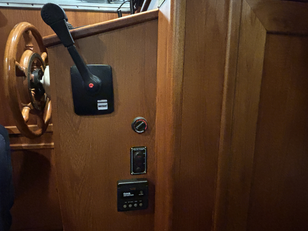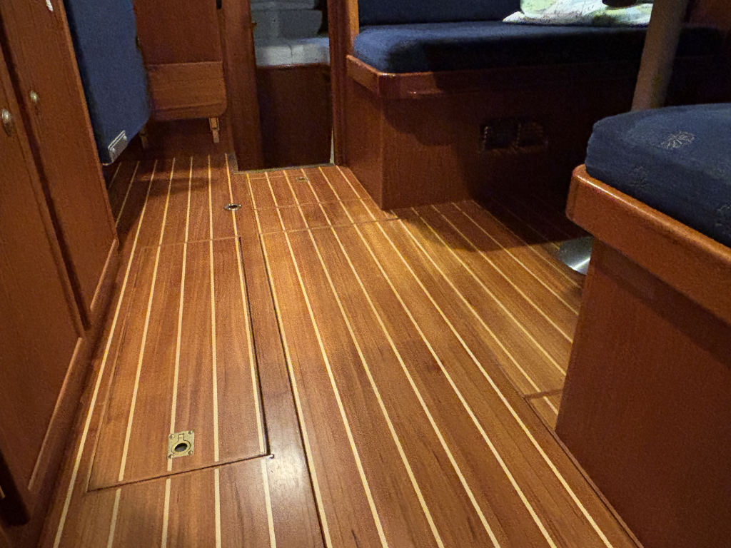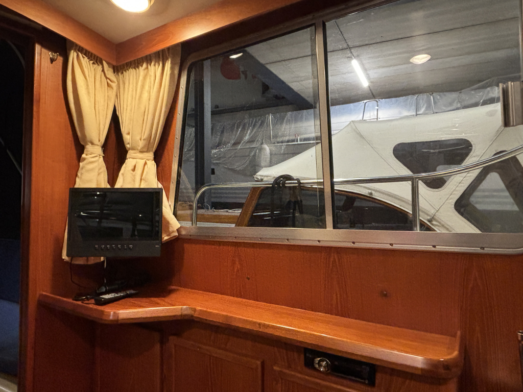 In het stuurhuis: twee zitbanken in dinette opstelling, het tafelblad is voorzien van veersysteem.