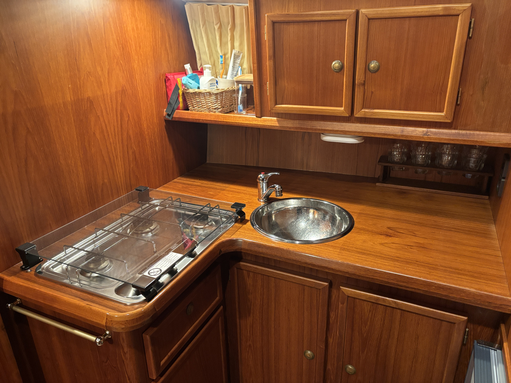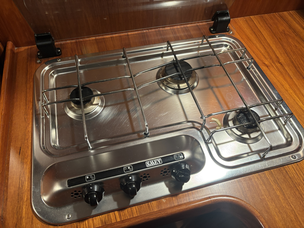 Kombuis in L-vorm met onder andere koelkast, 3 pits gascomfort en wasbak met warm en koud stromend water.