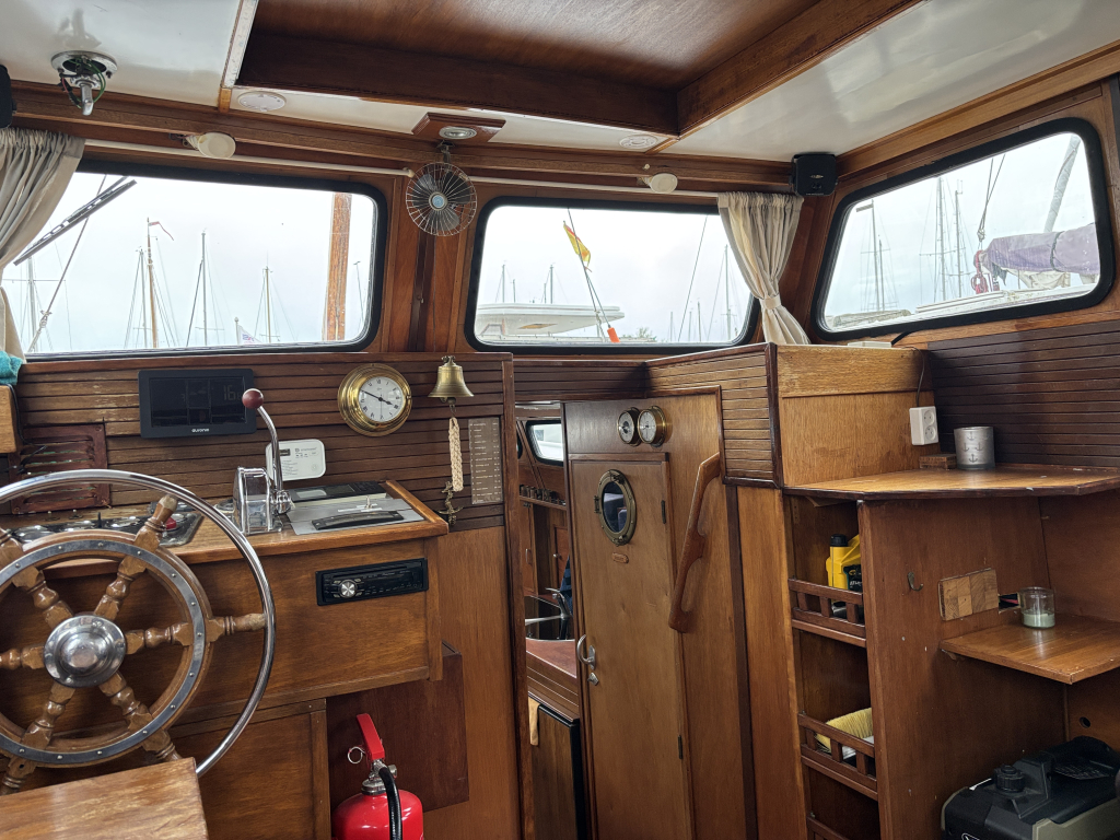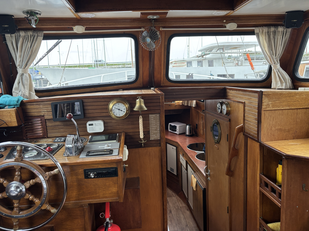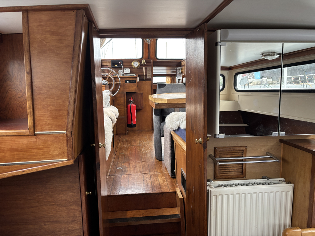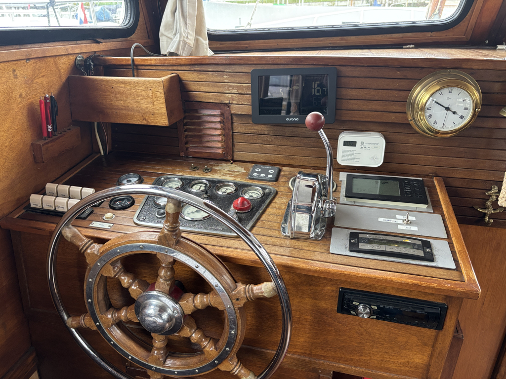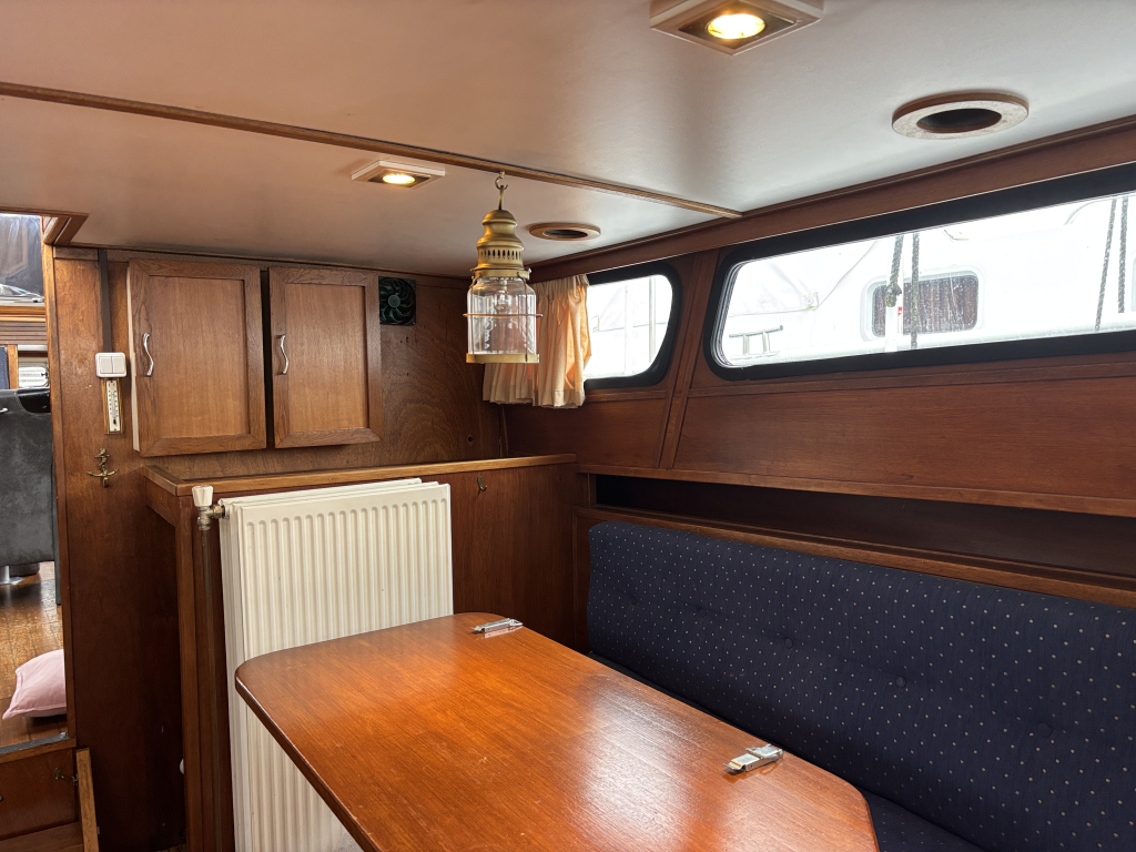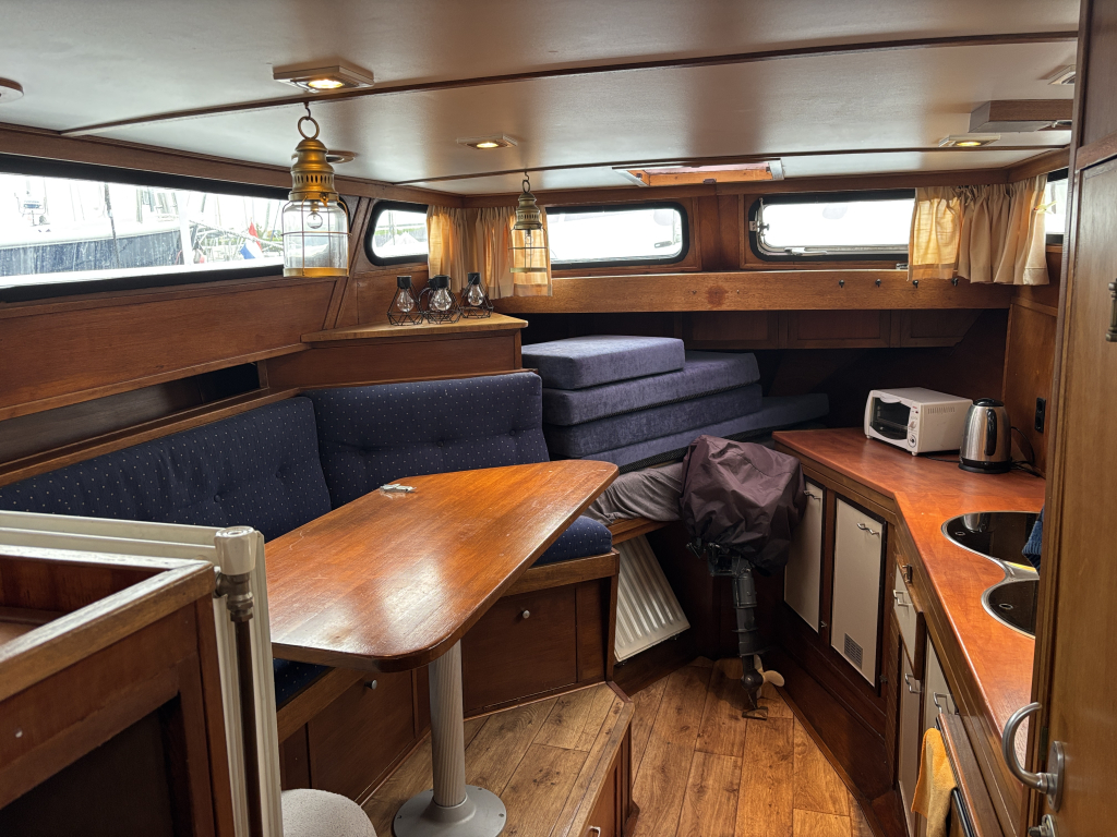 - Stuurhut met zijdeuren aan BB en SB, vaste banken, tafel in het midden en de binnen stuurstand.