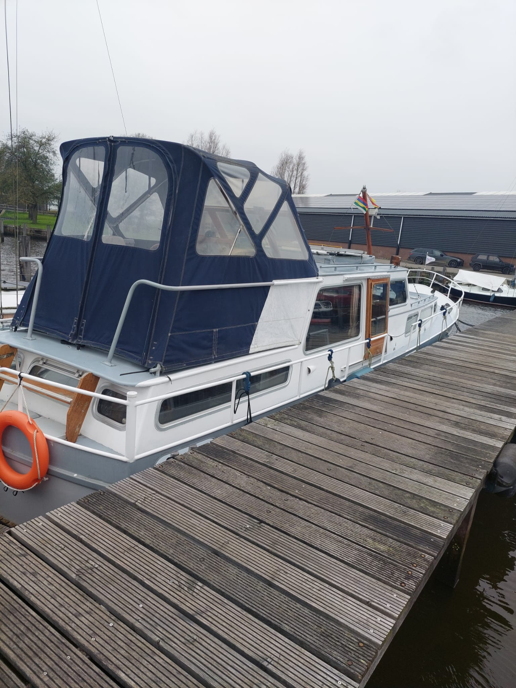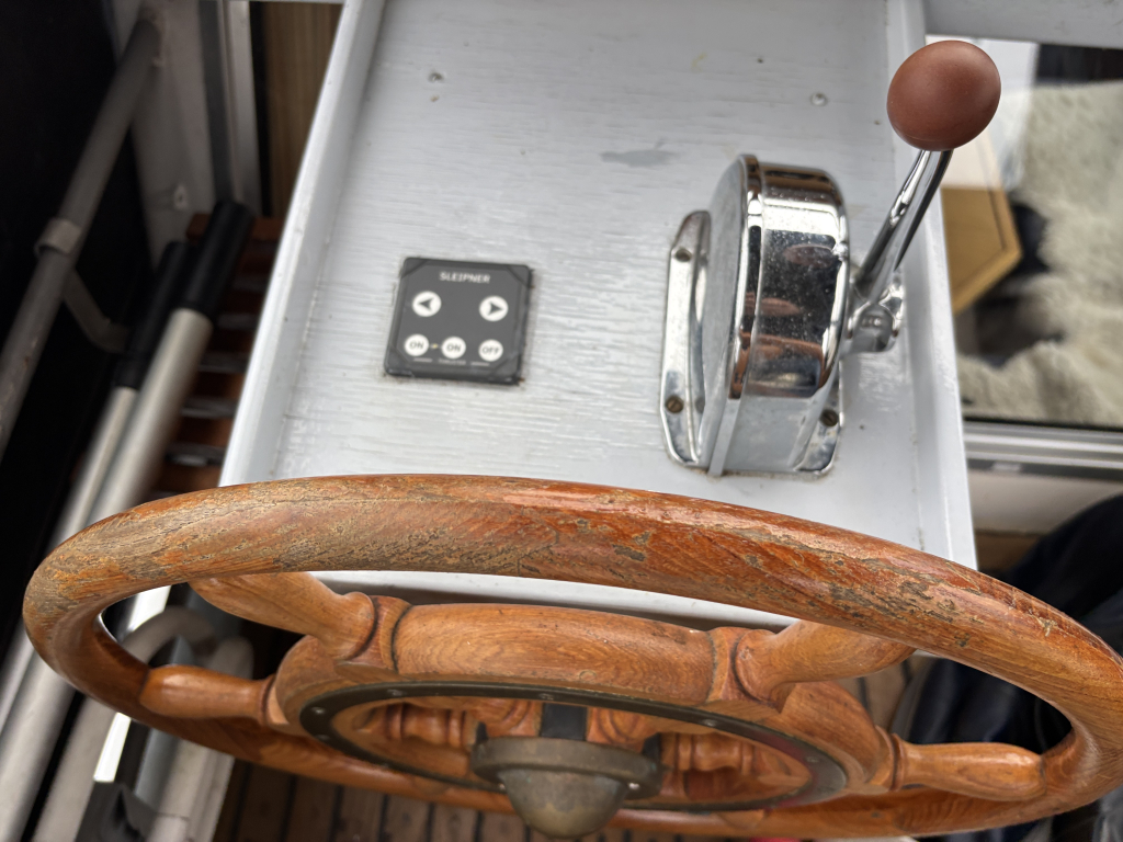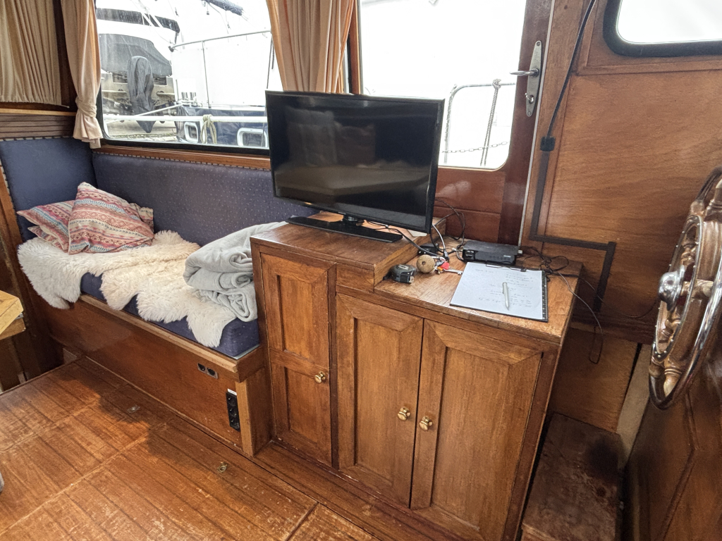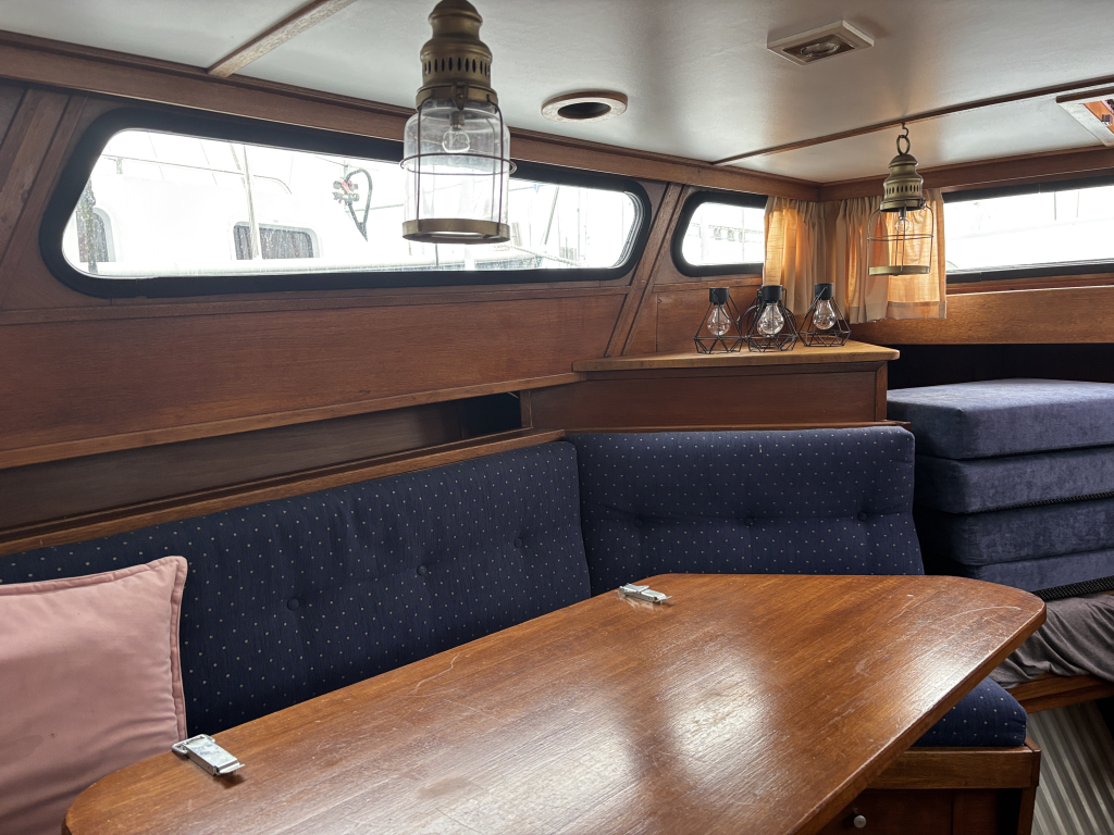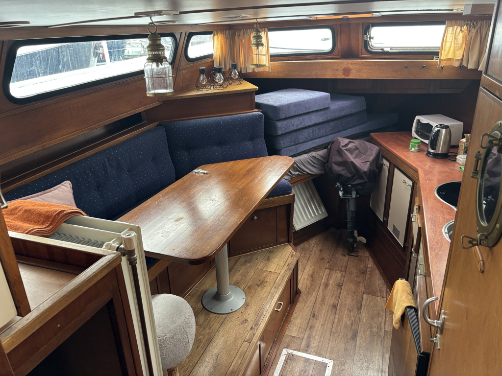 - Stuurhut met zijdeuren aan BB en SB, vaste banken, tafel in het midden en de binnen stuurstand.